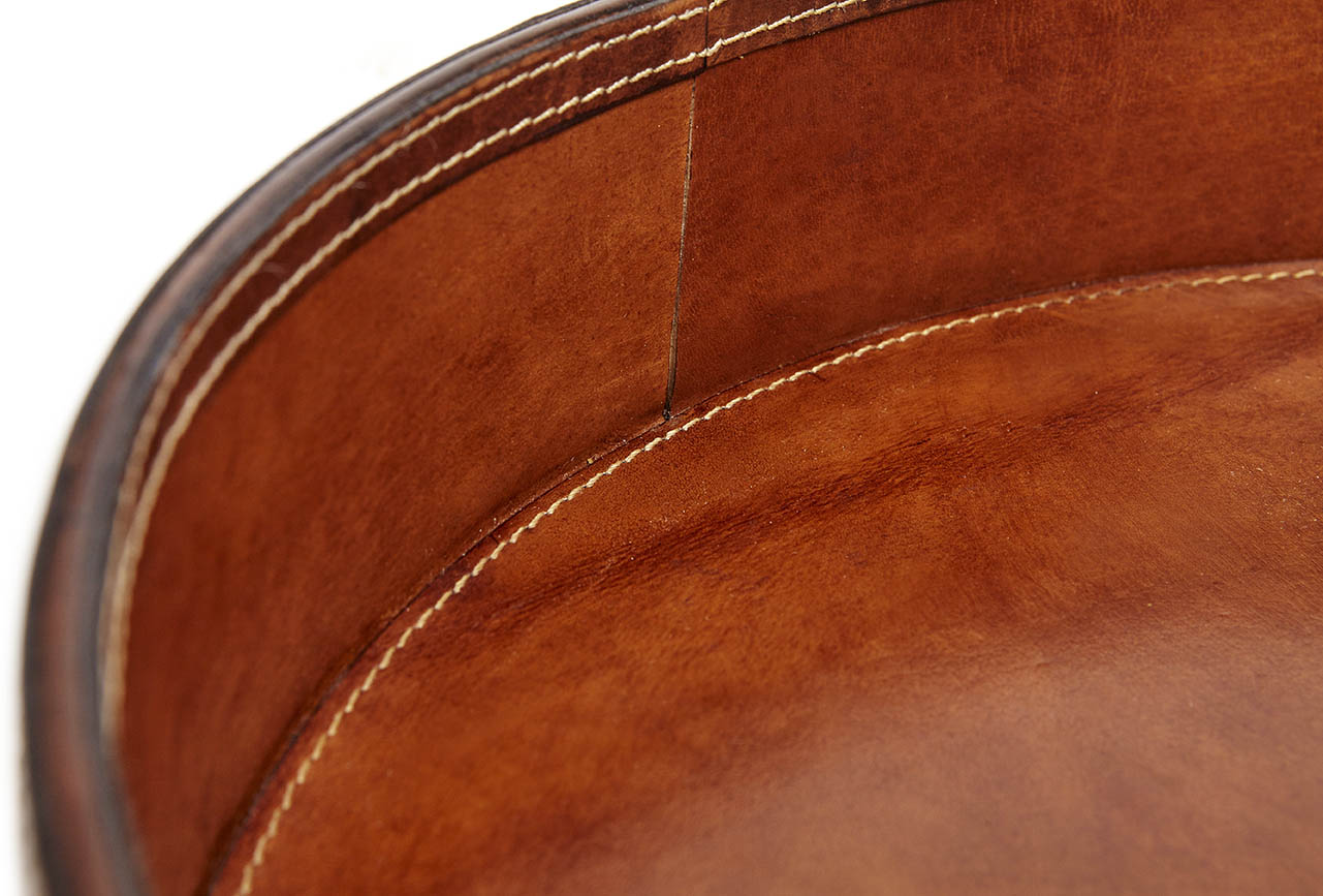The Wilton classic tan round leather drinks tray is the perfect size for serving G&T's or afternoon tea.