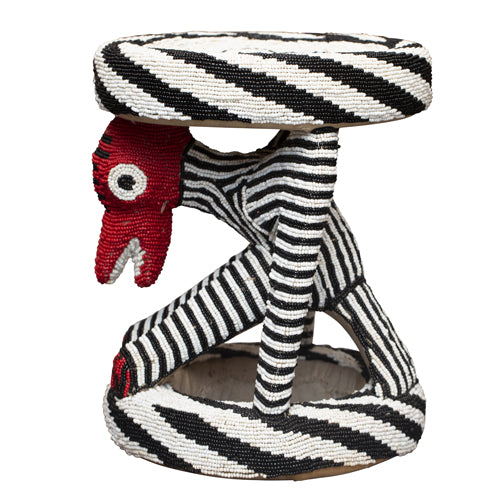 A traditional hand beaded stool from the Bamileke people of the Grasslands of Cameroon. Metal covered with cloth and embroidered by hand with glass beads.