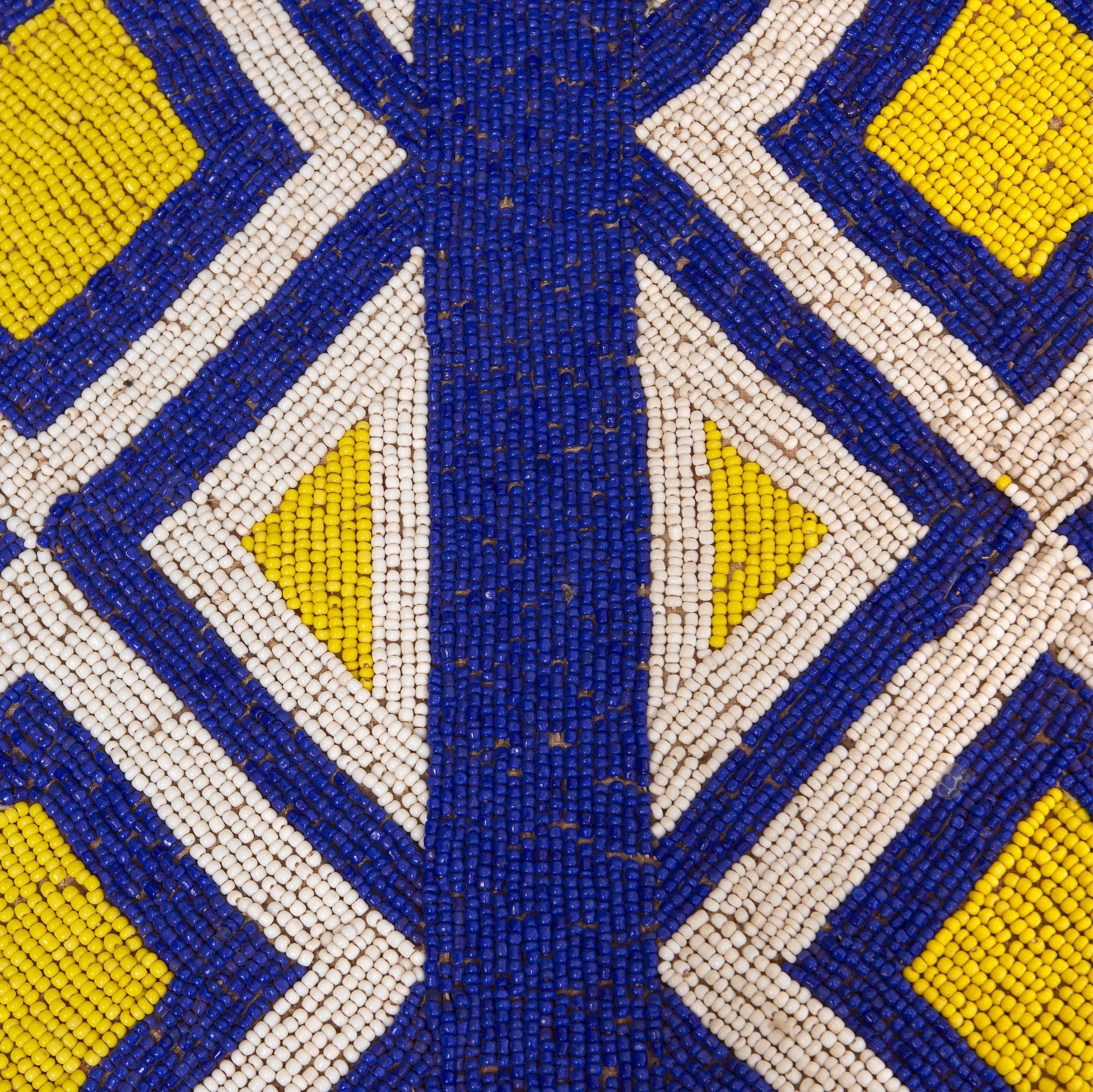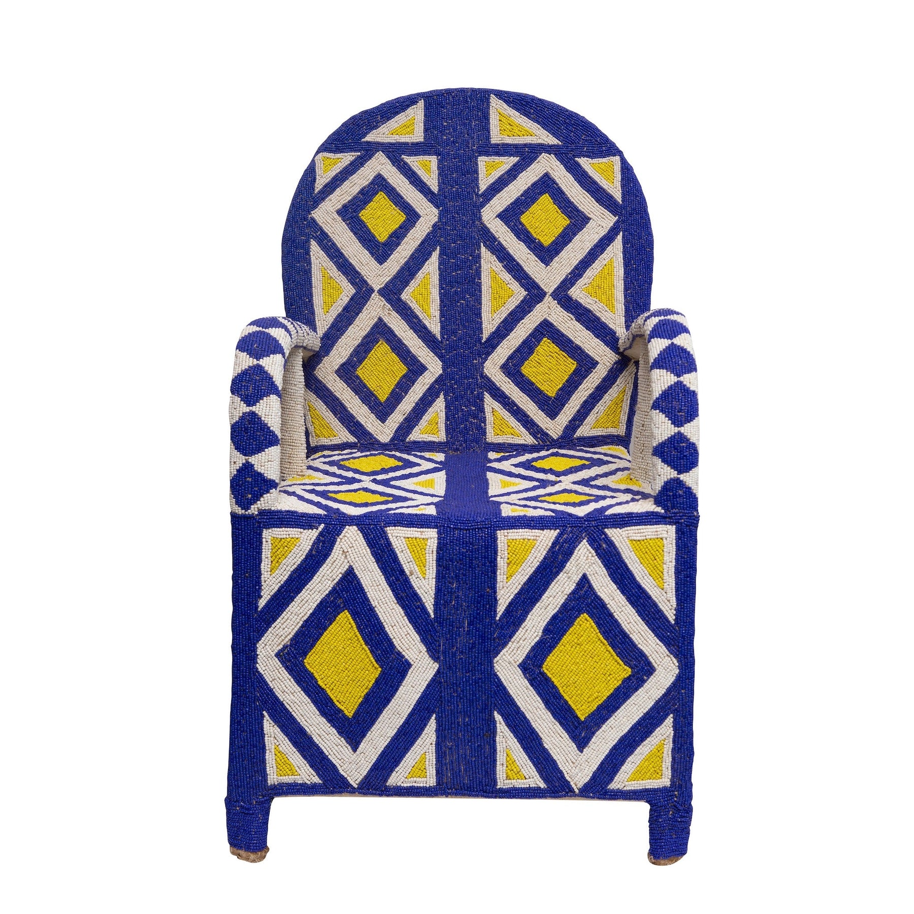 A traditional hand beaded throne chair from the Yoruba people of Nigeria in Cobalt Blue and Sunshine Yellow. A wood base covered with cloth and embroidered by hand with glass beads.
