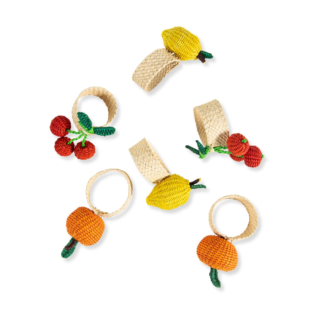 A charming addition to your table, these handmade raffia napkin rings pair perfectly with any napkins. Perfectly set the scene for a tasty Spring-themed meal, as well as brightening up the table with joyous colours and beautiful artisanal design. Set includes two cherries, two oranges and 2 lemons.