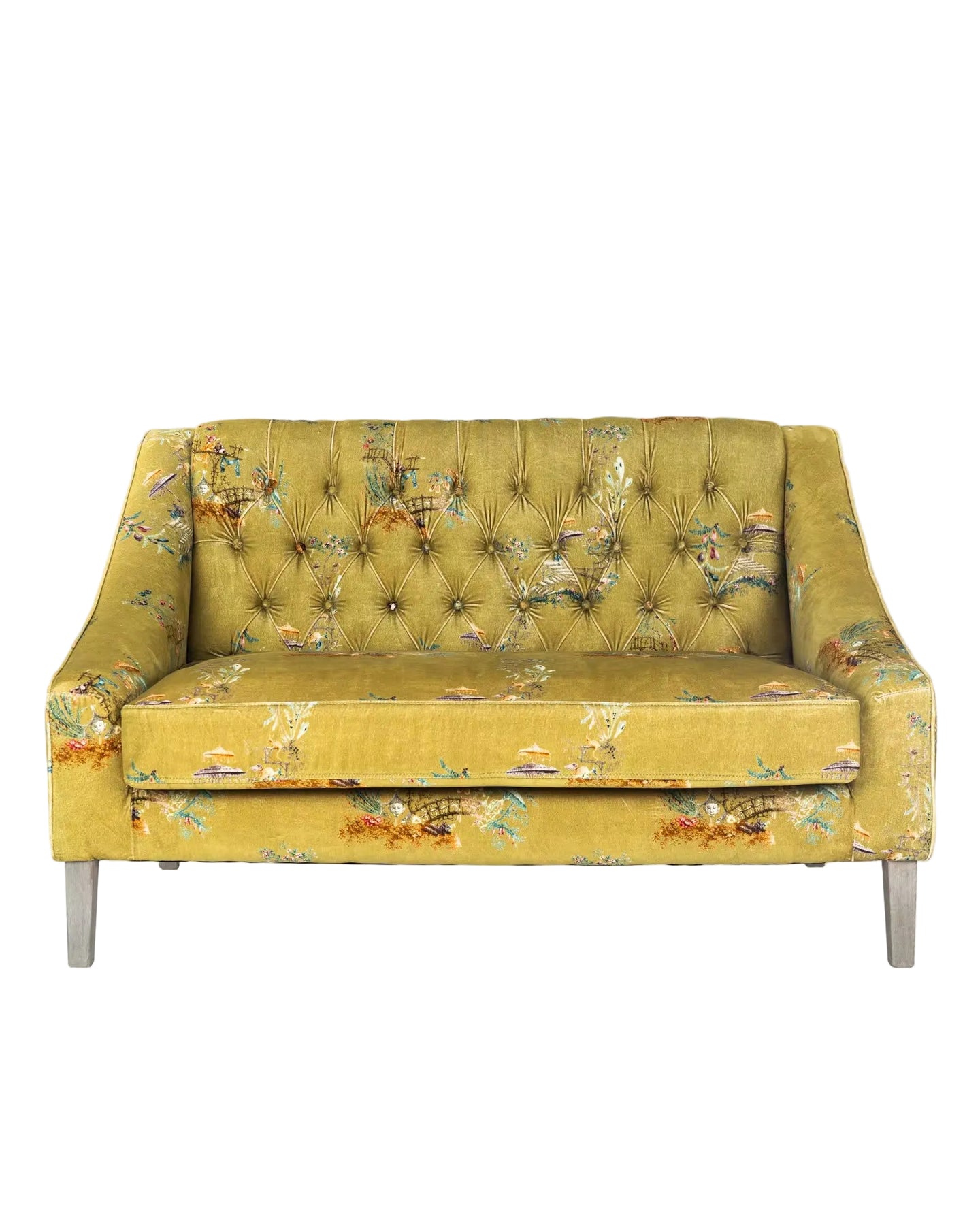 A classic, two seater French style sofa with an upright button tufted back and beautiful crescent arms. The comfortable stuffed cushion and distressed tapered legs completes this sophisticated piece of furnishing. Handcrafted in solid beech wood and beautifully wrapped in an eye-catching Chinoiserie velvet fabric.