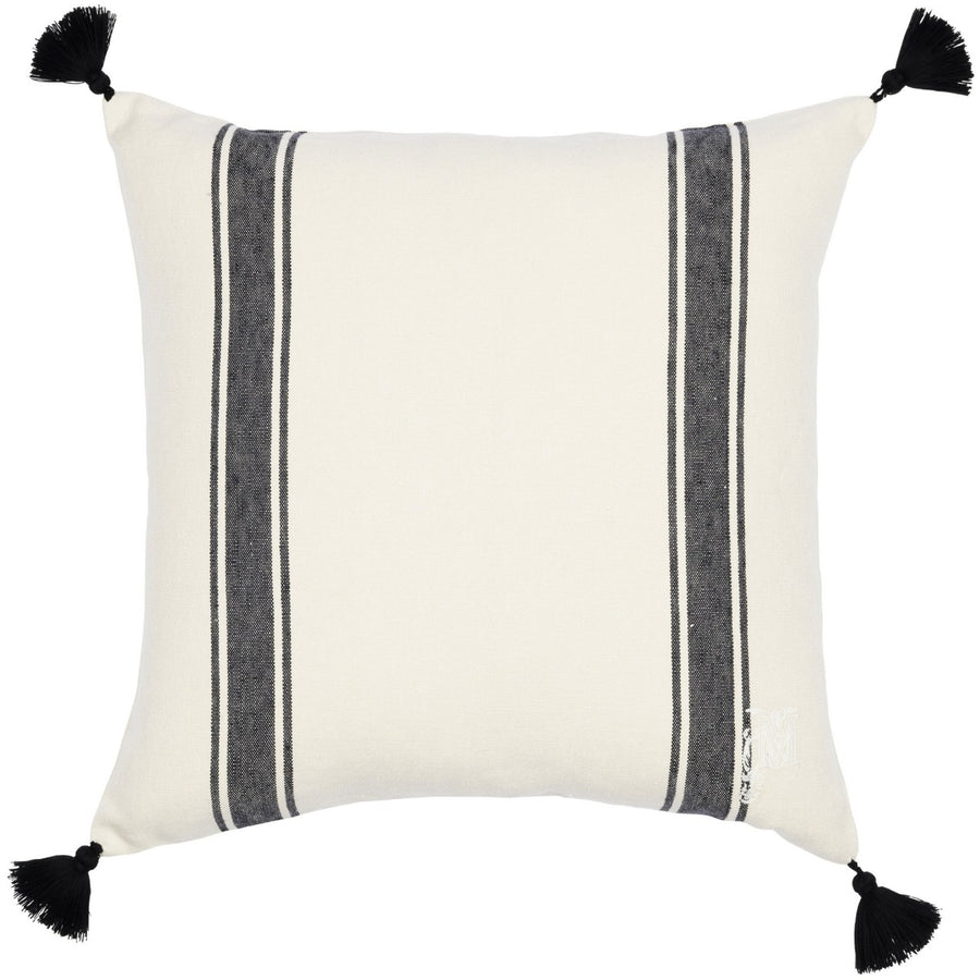 The genuine charm of the Transylvanian folklore is reflected in the tasteful stripes of this Hajdu Cushion. Hand-finished with black cotton tassels on each corner, the woven fabric has 100% duck feather filling.