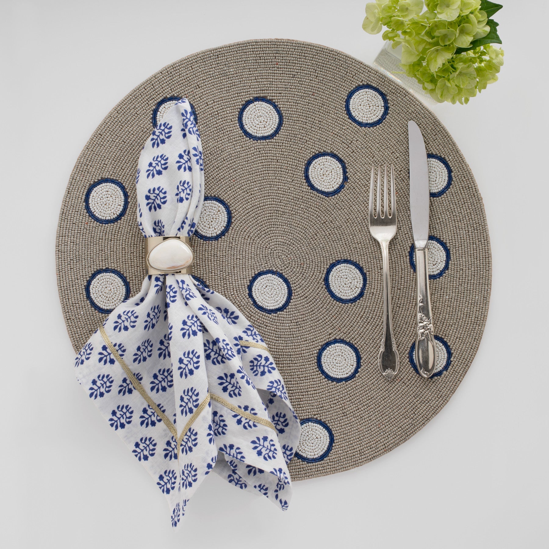 Mother of pearl and gold coloured brass are so elegant and timeless. These napkin rings are a year-round-favourite and work with so many of our napkins and placemats. Pair them with pastels for Spring or jewel tones for Fall ... the options are endless!