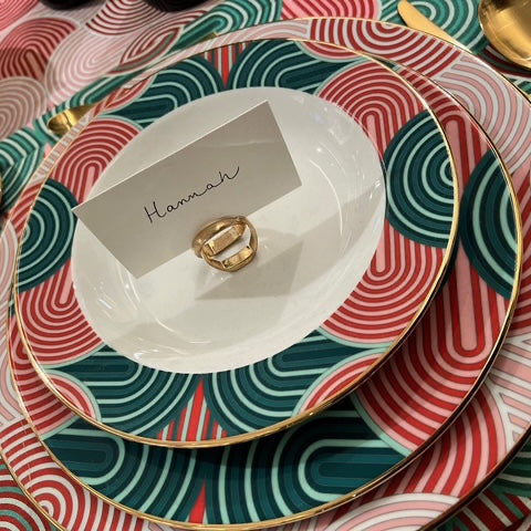 I wanted to make a placecard holder that would be super versatile and work with all of our new napkin rings. These holders can also be used as a standalone piece – they are of a scale that doesn't dominate but does add a noticeable, thoughtful detail!
