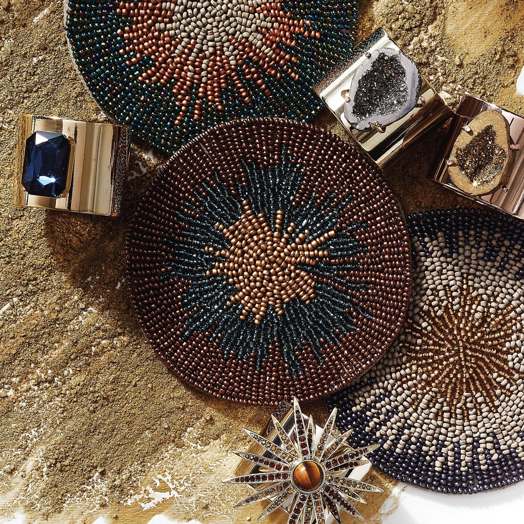 What a beautiful way to express the colours of the season, indigo and taupe and gold! Hand beaded with glass beads, these stunners will be the talk of the cocktail party!