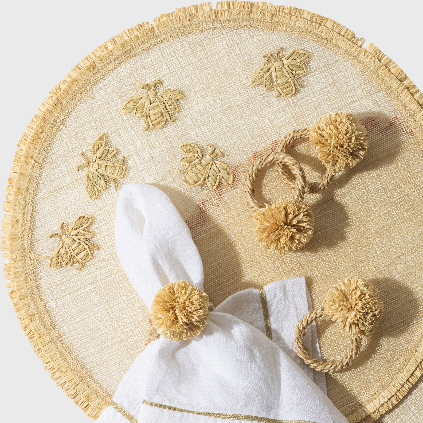 I wanted to bring our best-selling stripey bee placemats outside, so I dreamed up these gorgeous abaca placemats with hand embroidered bees and a fun double fringe at the edge. Abaca is a straw-like textile made from the fronds of Filipino palm trees. It's lightweight, durable and sustainable ... perfect for brunches on the patio or by the pool! The most perfect summer straw placemat!