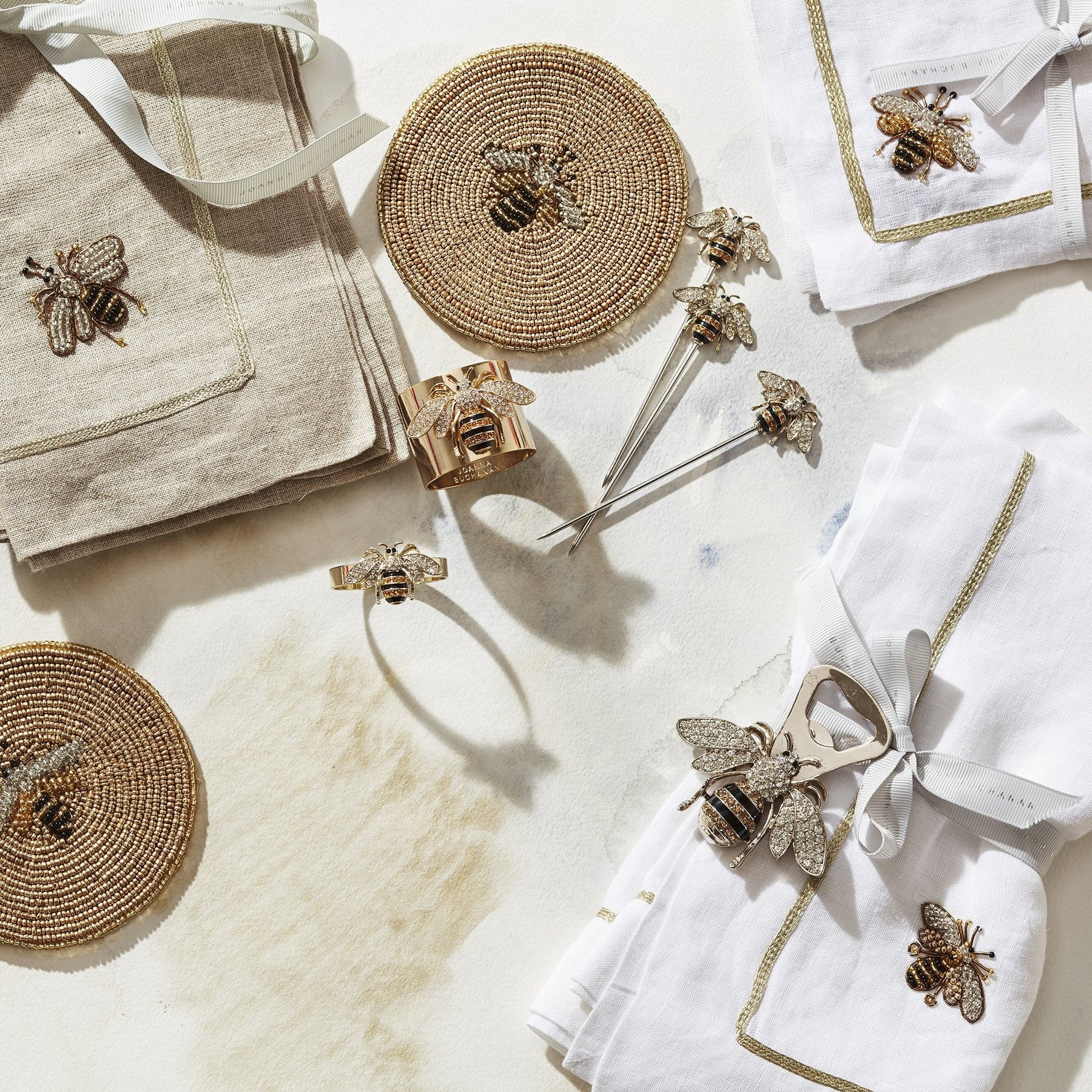 The bee works just about everywhere. Classic white linen dinner napkins, trimmed with a pop of gold edge detail.... such a novel way to add some buzz to your dinner party.