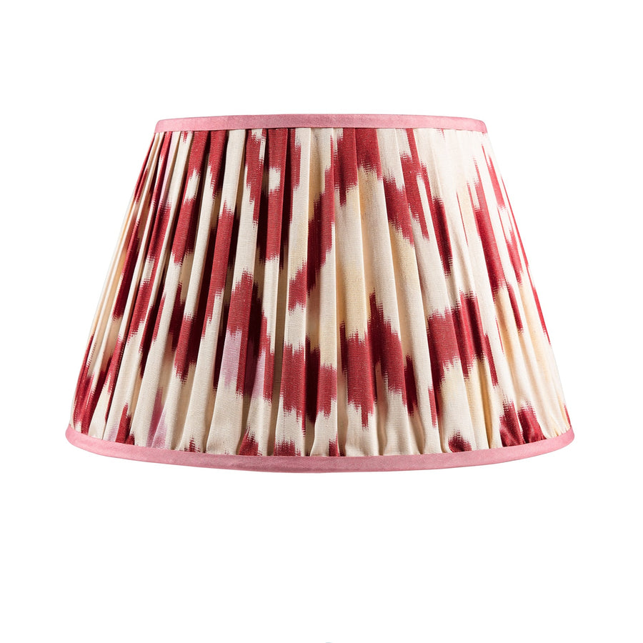 Handwoven crimson and cream Ikat lampshade, handcrafted in the UK by the best craftsmen using high quality fabrics from talented artisans from around the world. Each Ikat lampshade is delightfully unusual and individual in their sprawling chevrons and filigree curves. Perfect for luxury interiors!