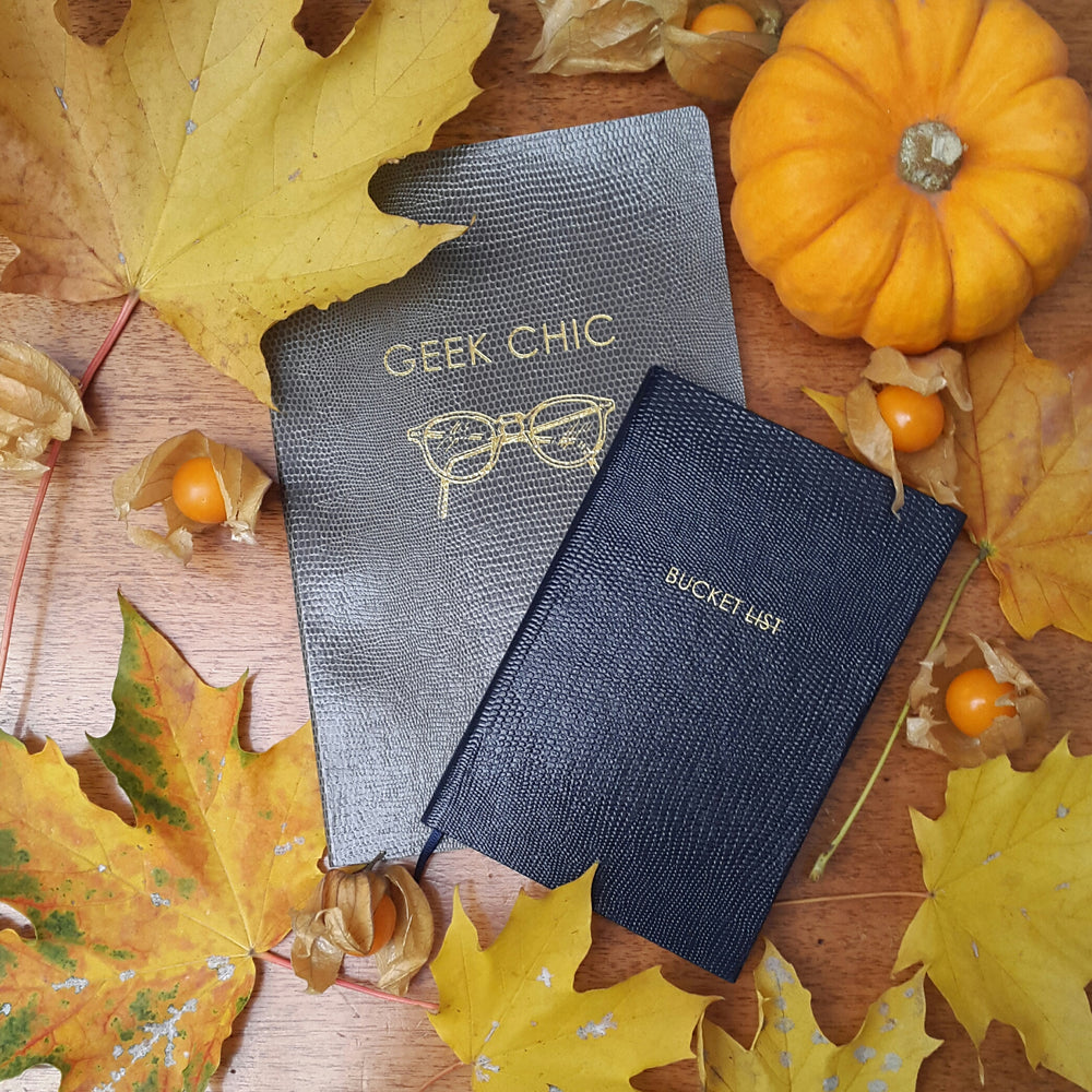 Geek will always be chic! A soft flexible cover embossed in gold foil and beautifully wrapped in faux navy lizard, our sophisticated and fun vegan diaries are handmade in England by classically trained bookbinders with 72 cream, unlined pages. Choose from a A5 (14.5cm x 21.5cm) or larger A4 (21cm x 30.5cm) size.