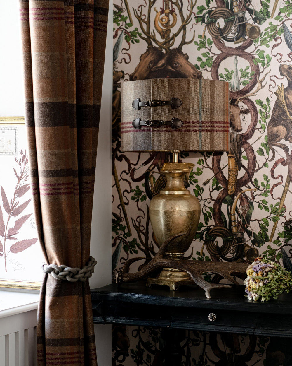 With its colourful but subtle accent stripe, the smart, classic check of the Chalet Wool fabric covers this versatile and cosy drum lampshade. This lampshade also features a pair of decorative leather buckles and a metallic gold lining. Available in three different sizes. Comes fitted with E27 metallic ring.
