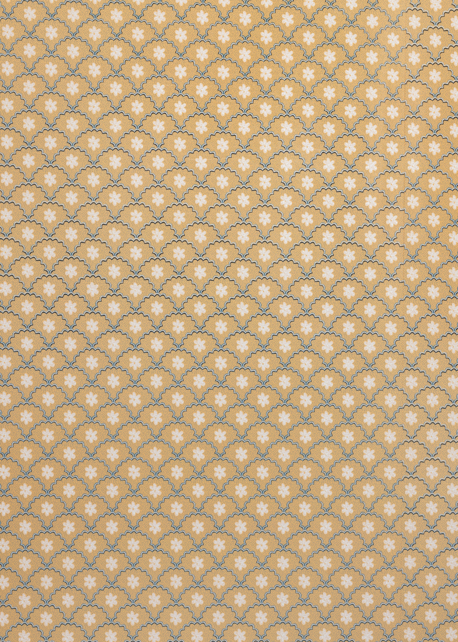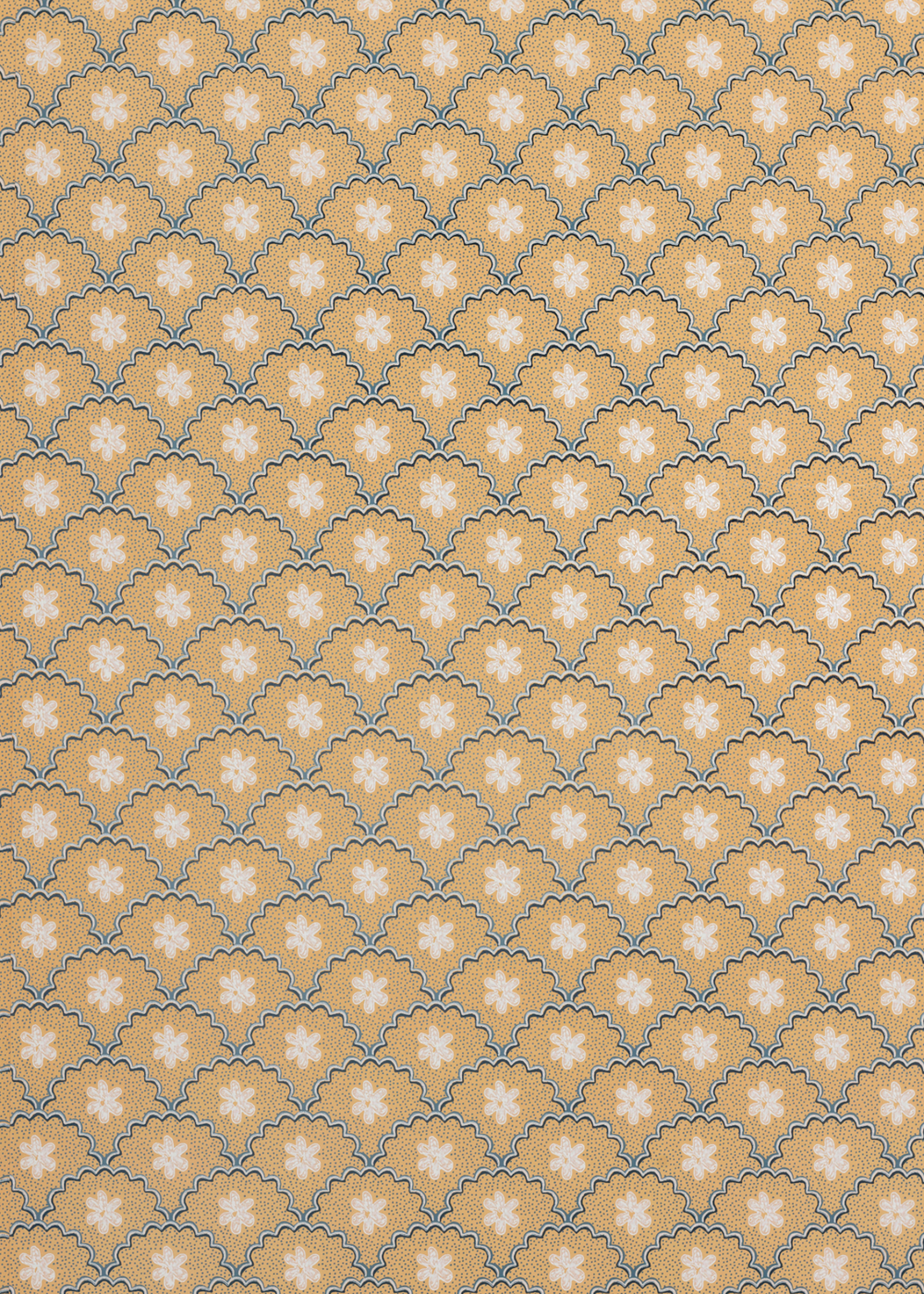 A small-scale repeat of pretty scalloped fans framing surface printed daisies. The three-tiered scallops and speckled background give a lovely tonal softness to this design.