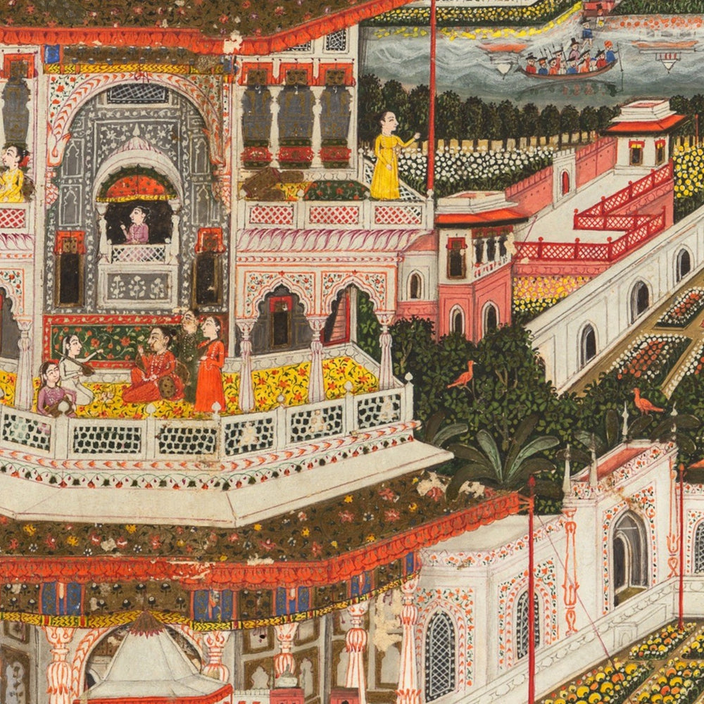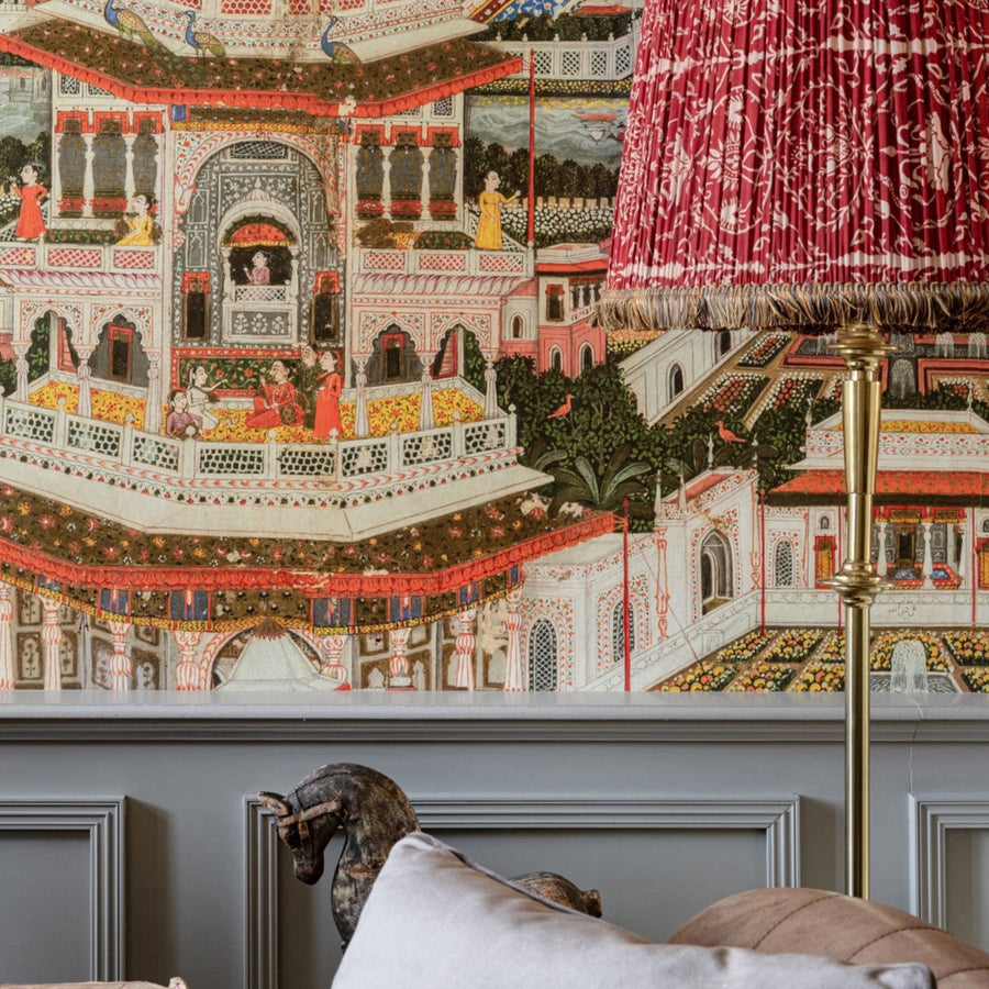 Wander through the exquisite gardens while the heady scent of a thousand flowers and gentle sitar music floats on the breeze with the Indian Palace wallpaper, a design that evokes the sights, smells and soft pastel shades of regal Rajasthan. Admire ornate motifs winding around the walls, gaze in wonder at colourful birds that dive through the air and brush your hands through cool water features as life continues throughout in this elegant print.