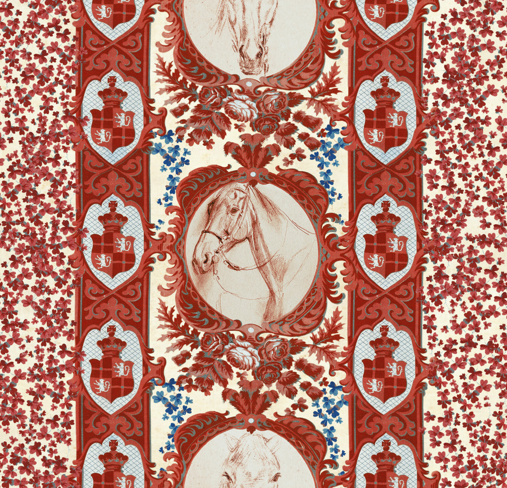 Immortalise the most handsome of horses and frame their luxurious manes, shining coats and long lashes with the Competition Panel Wallpaper. The unique pattern embodies the formality of fine portraiture, each hand-sketched and decorated with British florae including delicate roses, thistles and ferns. Stately coats of arms make up a subtle linear stripe alongside the illustrations, while miniature painterly petals create the supporting striped background. Available in either a rich red tone with contrasting blue floral details or vice versa.