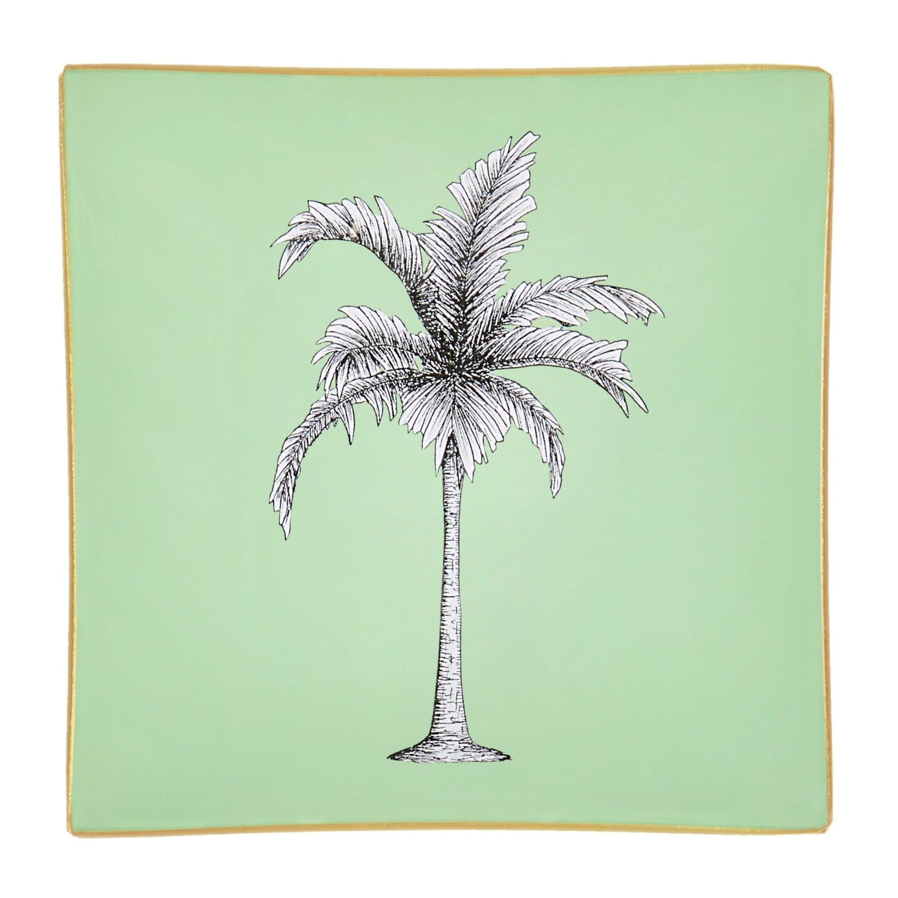 A decorative glass valet tray with a palm tree illustration. The tray is designed, illustrated and hand-painted by Melissa in her London studio and finished with an 18kt gold edging.