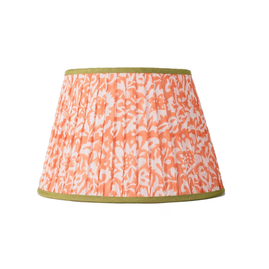 Handmade using an authentic Indian Saree, this beautiful gathered lampshade is vibrant in a bright coral orange and complemented with a peridot green trim. Perfect for luxury interiors!