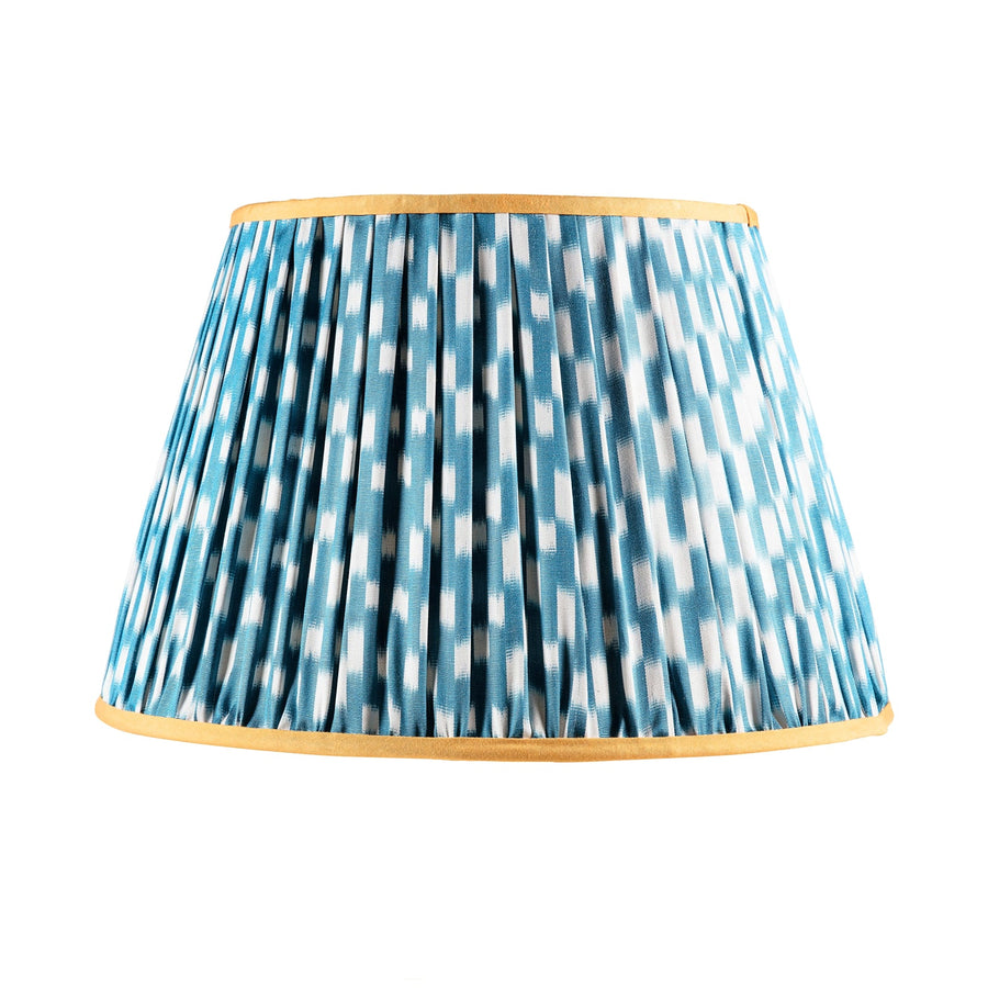 Handwoven sky blue and yellow Ikat lampshade, handcrafted in the UK by the best craftsmen using high quality fabrics from talented artisans from around the world. Each Ikat lampshade is delightfully unusual and individual in their sprawling chevrons and filigree curves. Perfect for luxury interiors!